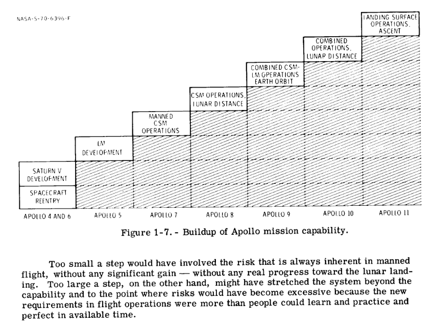 Isn’t this really cool? These are the incremental steps that the Apollo engineers planned from the beginning. Obviously, they had a goal of “landing a man on the Moon and returning him safely to the Earth”, as Kennedy put it. Any task that worked towards that goal was good. Any task that worked against it was bad. If a task does not get us closer to the goal, at least it can be ruled out and we’ve probably learned something as a result. Perhaps it was even a necessary step to get to where we’re going next. Let’s jump a bit further in the document: