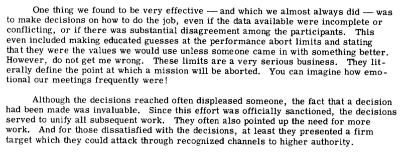 Perhaps some of the smartest people of the past century were pooled together in the 1960s. Their mission was to get humans on the moon as part of the Apollo program. It’s certainly an astonishing feat of human ability. However, what had escaped me until about a month ago is that these people made a handbook on how they achieved it. Seriously. The document is called What made Apollo a success? (1971), and there are some real gems hidden in it [4]. Even better, you could find the exact same parallels, check this out: