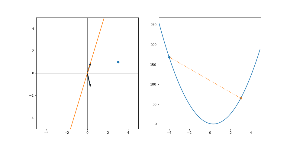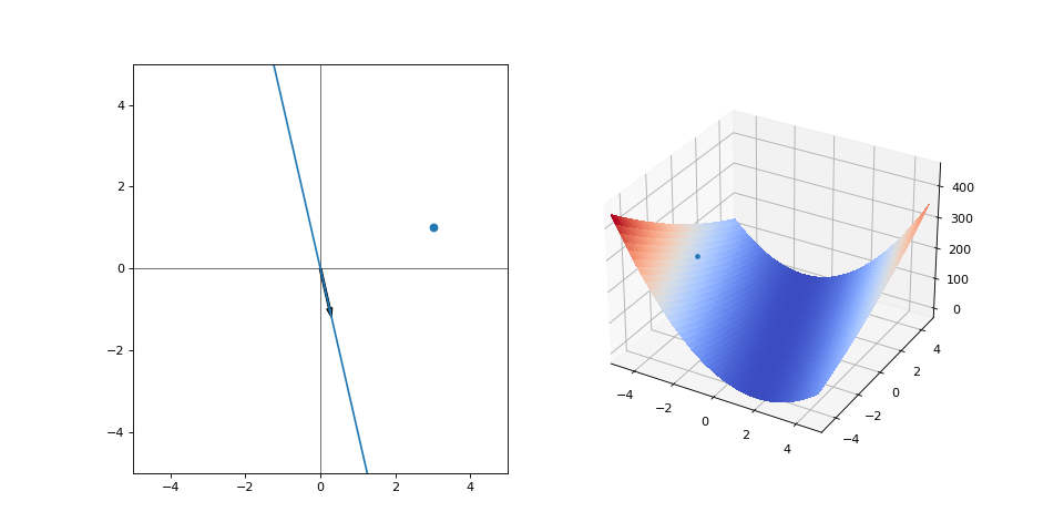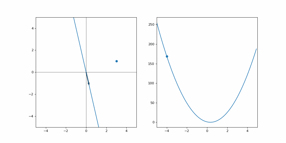On the left is the line that we are currently drawing, while on the right is the loss (y-axis) with respect to values of \(\alpha\) (x-axis). The loss used is the simple mean squared error, meaning \(loss(\cdot) = (y - f(x))^2\). We have only one datapoint, so it is calculated just for the point (3, 1). Here, \(\alpha = -4\) is my pair of beginner climbing shoes, the grayboxed level of Uncharted and the current approximations of performance abort limits on the Saturn V rocket. It’s not great, but it’s what we’ve got. All we can do is to look at where we are right now and approximate a direction. The gradient of the loss wrt. \(\alpha\) is: