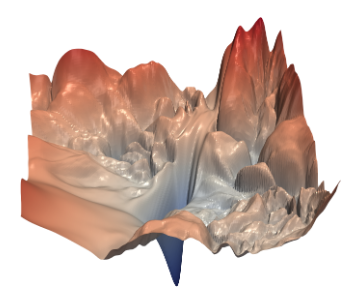 The learning rate is sometimes referred to as the step size. Increasing it makes changes during each step larger, decreasing it makes them smaller. An intuitive analogy is to think you’re on top of a foggy mountain and want to get down. The fog is so intense that you cannot see where the ground levels out, where your goal is. Therefore, you have to resort to approximations. You proceed by estimating in which direction your elevation decreases the most, moving in that direction for a bit and then starting again. Importantly, you can’t constantly change direction as re-estimating takes time and effort. There is no way to “look further” or “collect more information”, you work with what you have. Not every step is in the best direction, but by at least making steps you’re still going somewhere. Metaphorically, any non-trivial mountain is uneven. You’d need insane luck to be heading in the optimal direction on the first try. So don’t count on it, there will be mistakes. Especially for complex neural networks, the optimization landscape is extremely non-convex and not easy to navigate. Below is a visualization by Li et al. [3]: