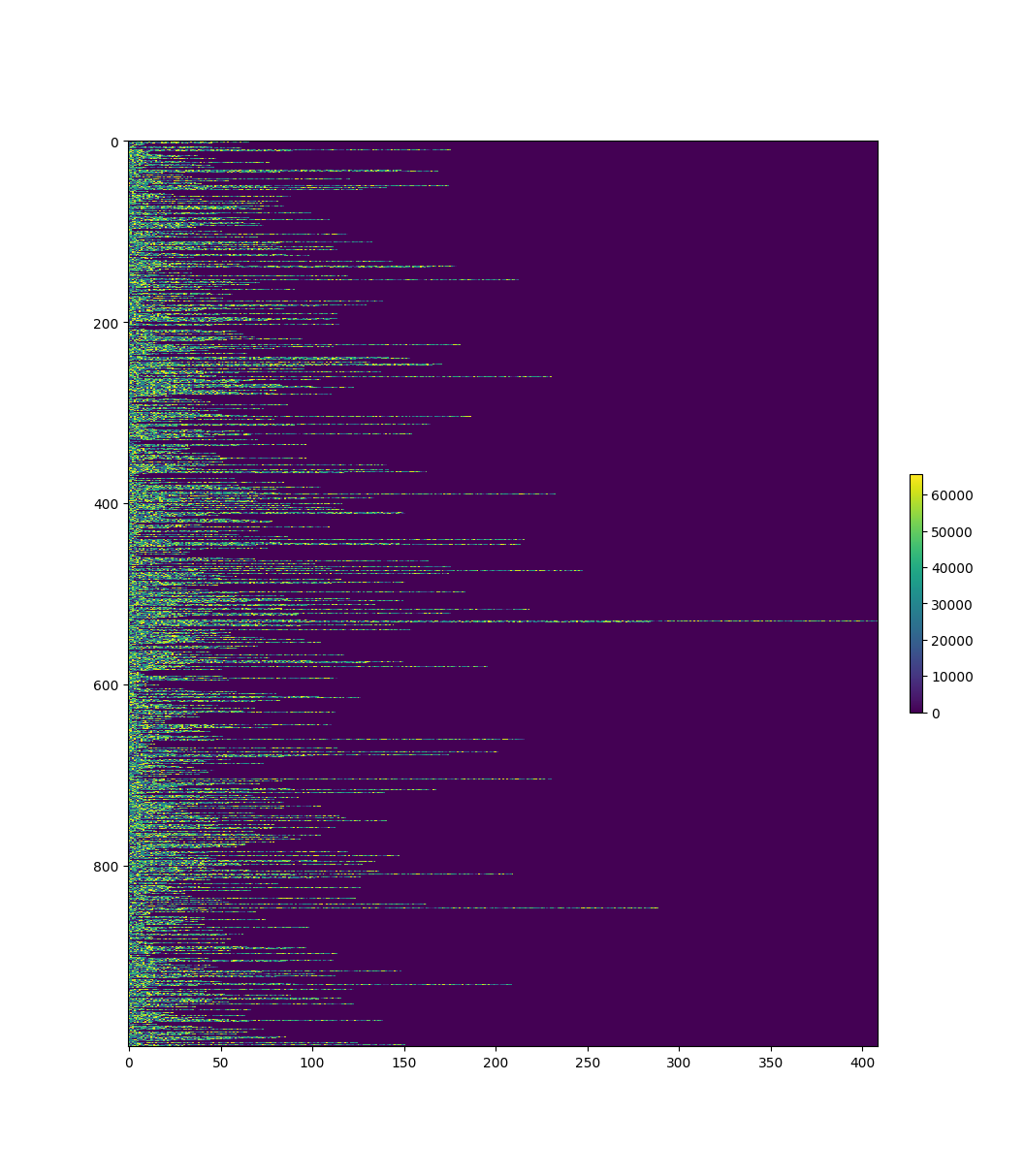 This process gets repeated over and over for all batches, with us either discarding or masking out all of the values that get calculated for the padding tokens. Thinking for a moment about how matrix multiplications happen inside a GPU, there is a limited amount raw computations that can be performed in any given timeframe. When we process a batch like this, we are saturating that capacity with garbage calculations whose results will get thrown out as soon as they finish. Here is the heatmap for the entire dataset:
