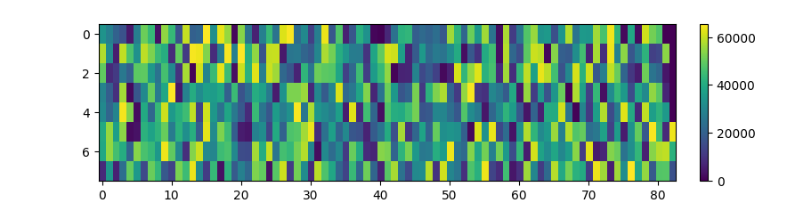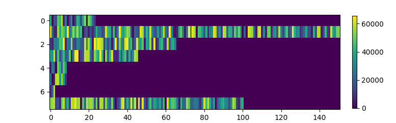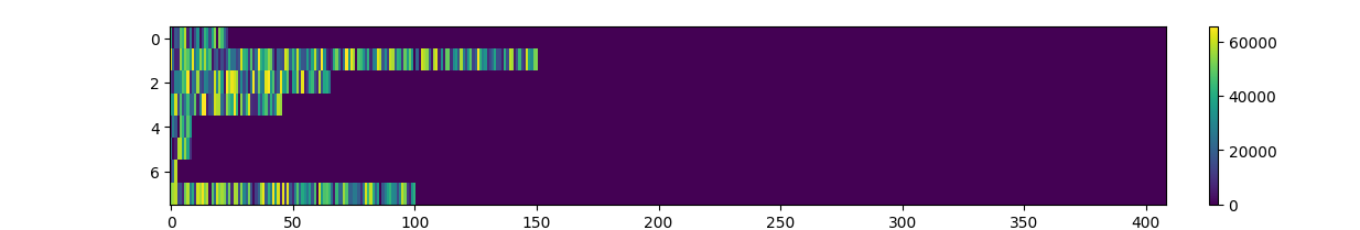 Here, we have a heatmap that shows the first batch of 8 reviews. Every row is a document, and all documents have now been padded to 409 tokens as part of the batching. Here, each color represents a token at a specific point in a review. The colors go up to 60000 or so, as that is the largest vocabulary index present in this batch. Now is a good time to remind ourselves - the tokens that make up a review were randomly generated. This means that any time the same color appears twice, that means there is a duplicate token. One can’t help but notice the massive purple section at the end of every single row. That’s all just padding.