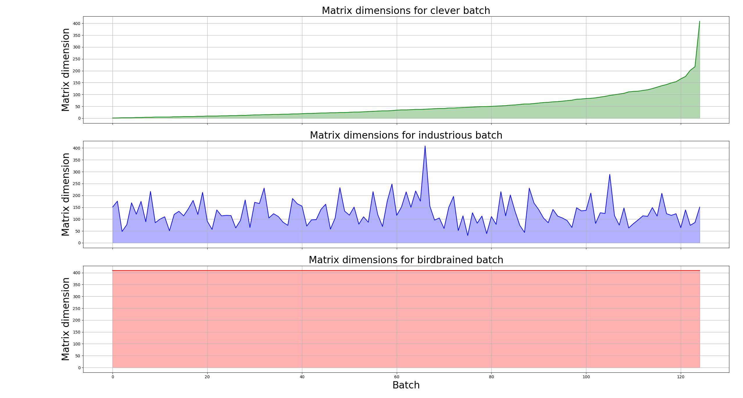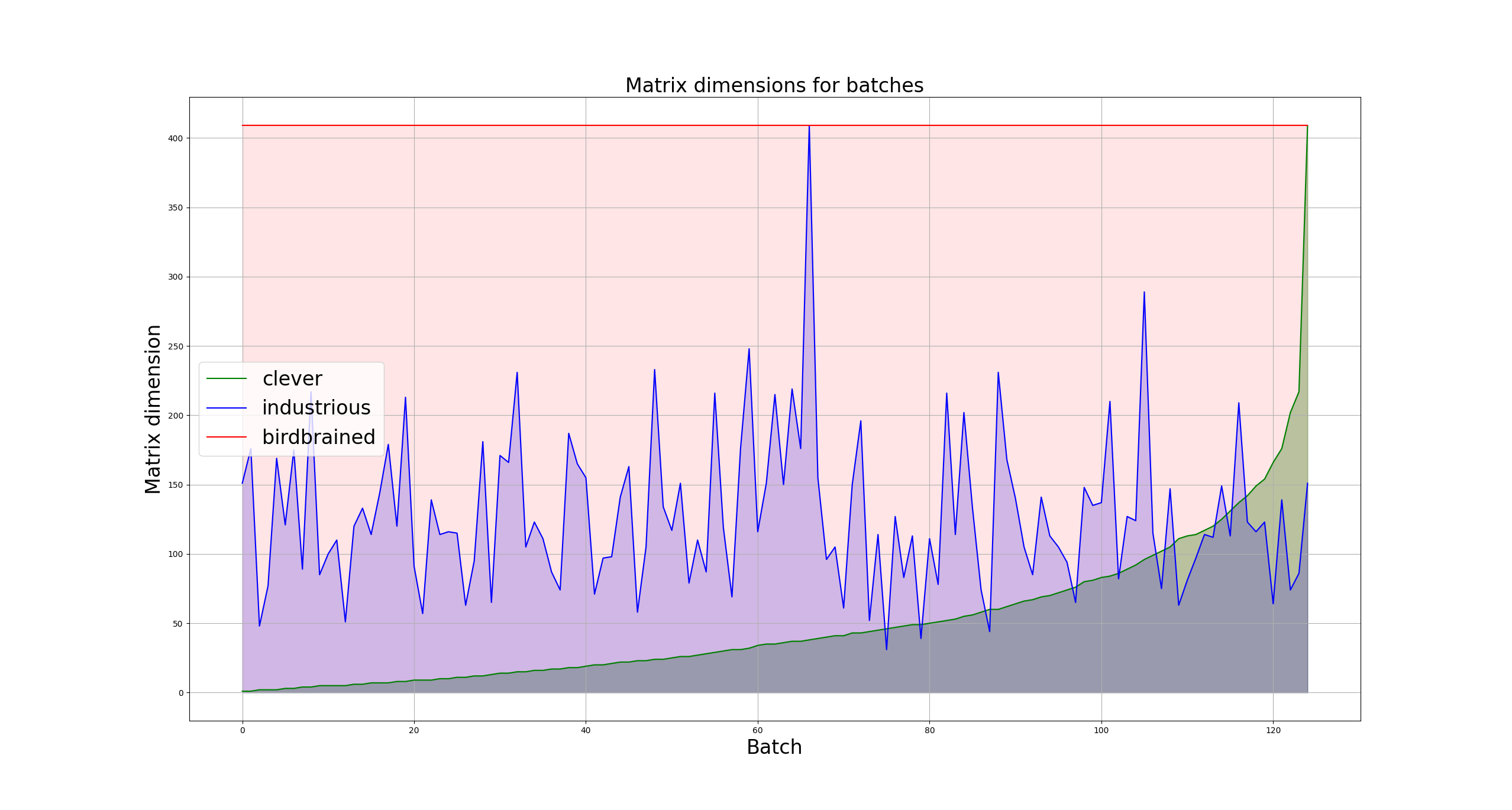 Here, we have plotted the first dimensions of the matrices being passed through the model in each batch. This is to say, we are plotting the length that each review is padded to in each batch. As this value defines the dimensionality of the matrices being multiplied during the forward pass, it is a good litmus test for computational complexity. The larger the colored area, the more computation is required. Let’s place these graphs on top of each other: