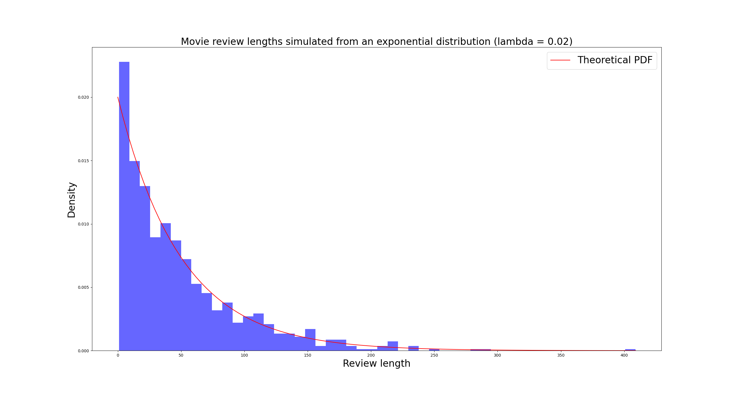 You can probably come up with a dozen ways this could be used off the top of your head: customer service request durations, equipment usage times between malfunctions, radioactive decay… If we parameterize the distribution to match our historical data, we can evaluate likelihoods for future events with some degree of confidence. Here, we can use an exponential distribution to model the lengths of our movie reviews. You could just as well (and perhaps more sensibly) use a geometric distribution. In any case, we sample 1000 values from an exponential distribution and discretize them to signify movie review lengths: